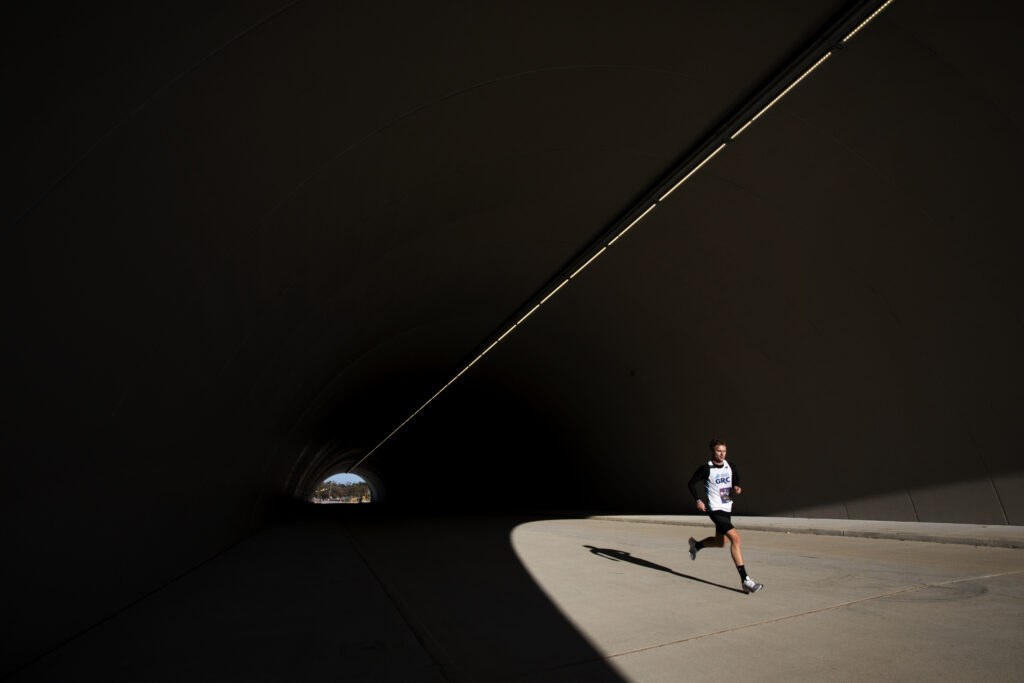 Runners pass through the new land bridge tunnels along the route at Memorial Park during the Chevron Houston Marathon Sunday, Jan. 16, 2022 in Houston, TX.