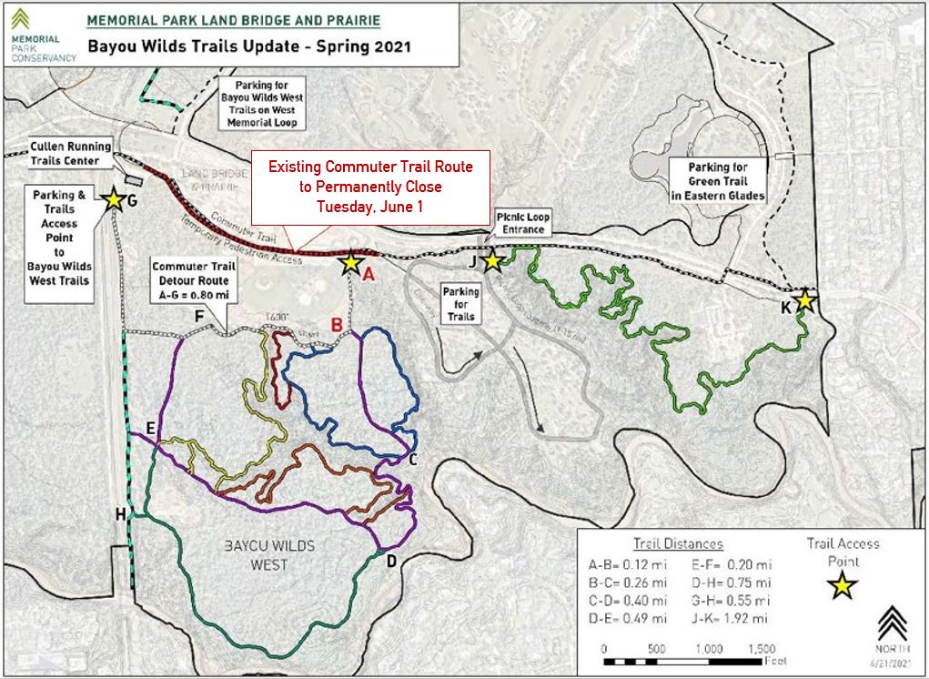 Mountain bikers are especially fond of trails located in the Bayou Wilds, the southwest section of Memorial Park. These trails are color coded with maps at the trailhead signs. Mountain bikers are required to stay on the trail system in order to protect our fragile ecosystem.  The trails are mixed-use and shared with hikers; please use trail etiquette such as announcing your presence, being mindful of blind turns, and yielding appropriately to safely share trails. The mountain bike trails are affected by weather and are closed if conditions warrant to preserve the trails. Electric or motorized vehicles such as motorized bikes are strictly prohibited in Memorial Park’s southside trail system.